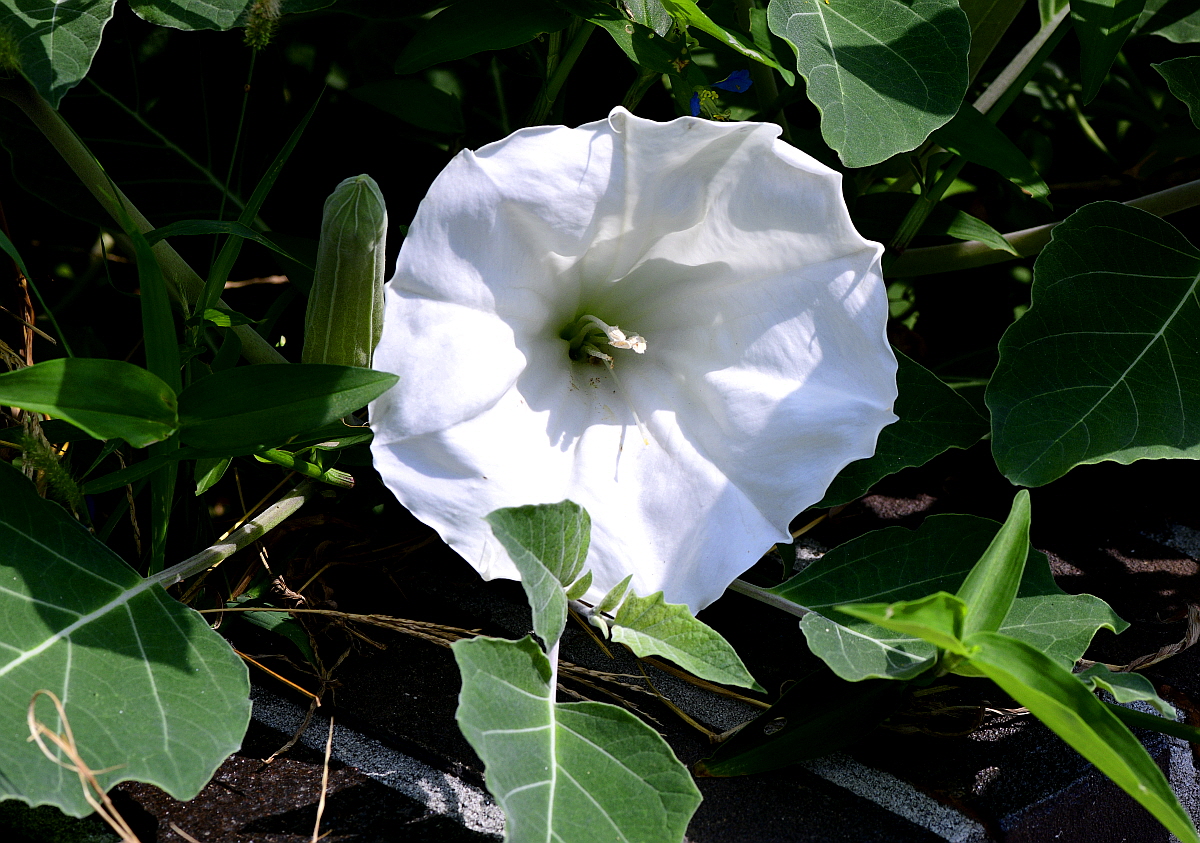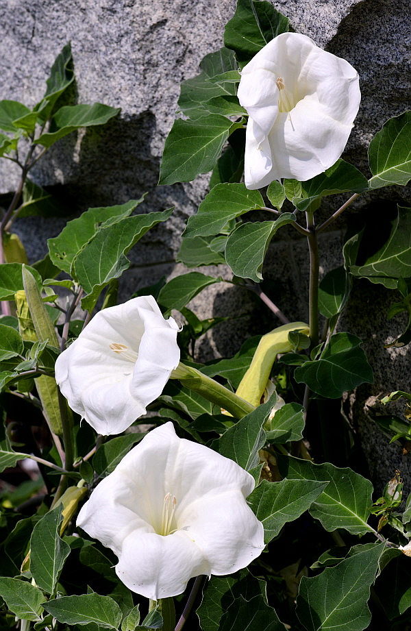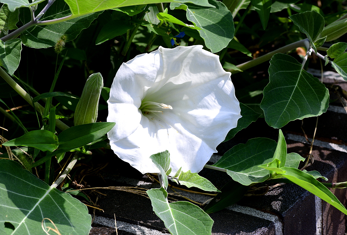 꽃은 6~8월에 백색으로 잎겨드랑이에 1개씩 달리며 나팔 비슷한 모양이다.