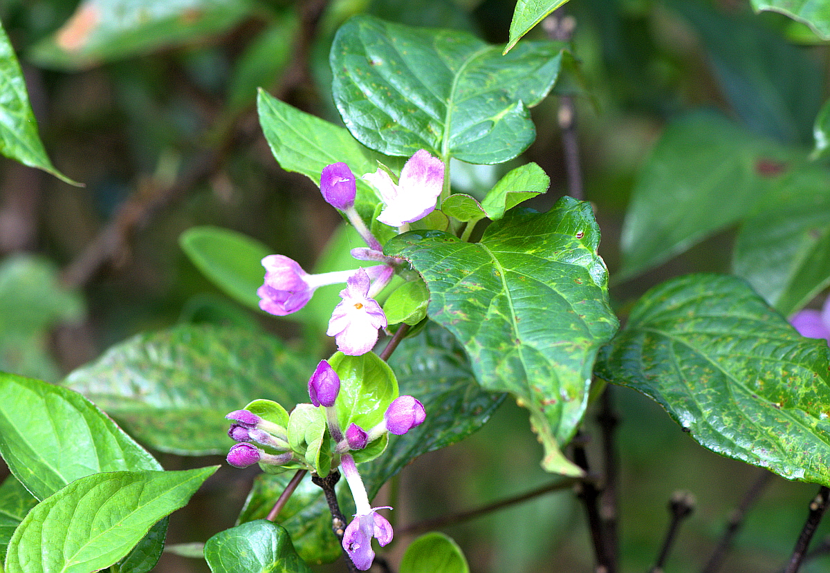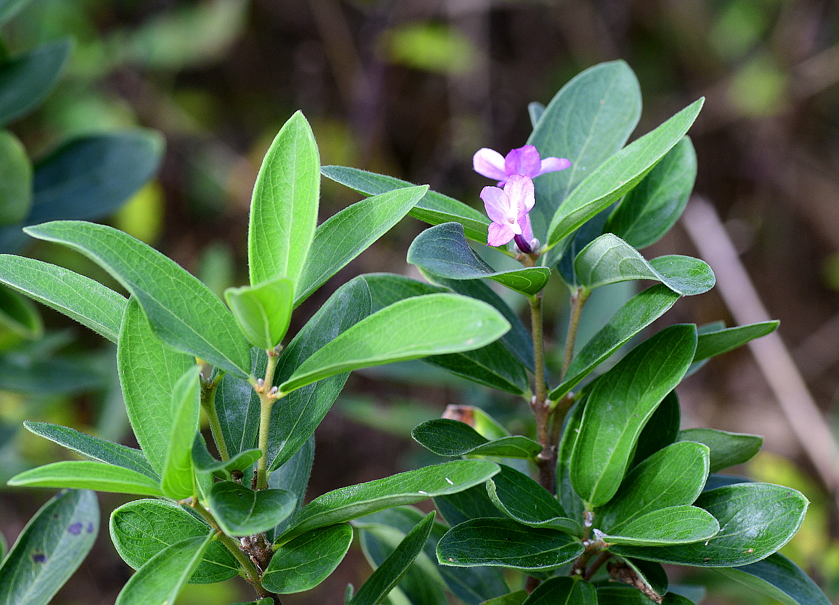 잎은 마주나지만 때로는 어긋나게 달리고 긴 타원형 또는 거꾸로 선 바소꼴로 뒷면에 털이 있으며 가장자리가 밋밋하다.