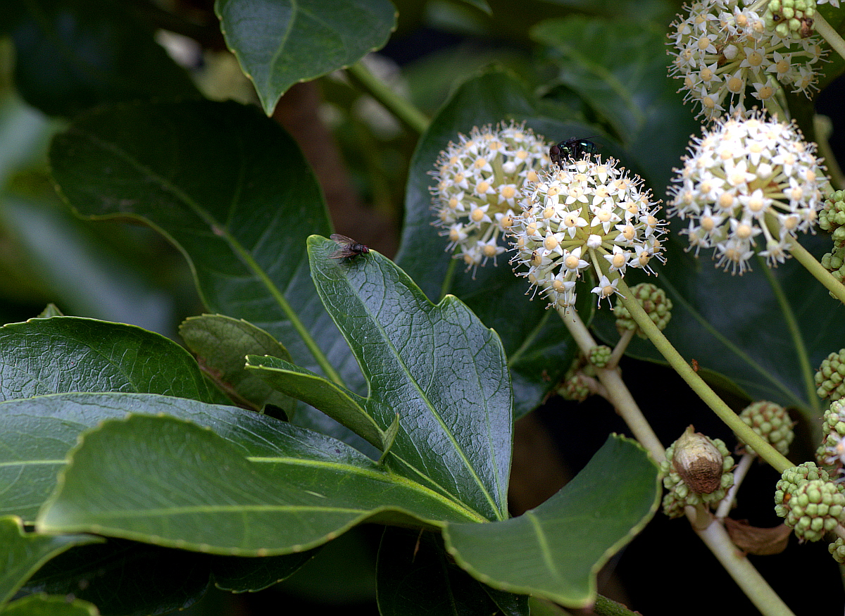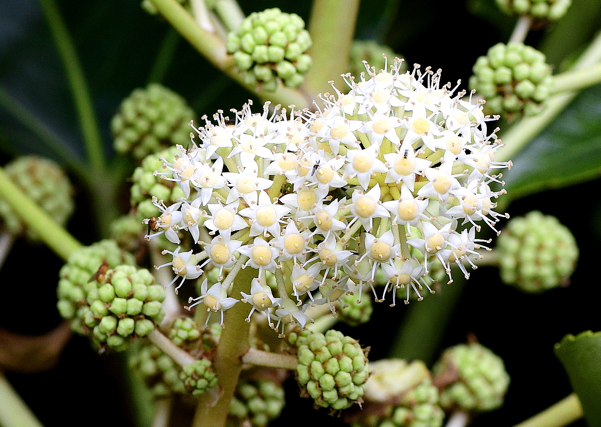 꽃은 잡성화(雜性花)로서 10∼11월에 흰색으로 피고, 커다란 원추꽃차례로 달린다.