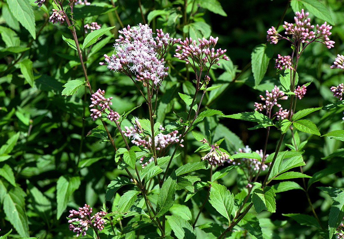 꽃은 8~10월에 연한자주색으로 줄기와 가지 끝에서 머리모양꽃이 모여서 산방꽃차례를 이룬다.