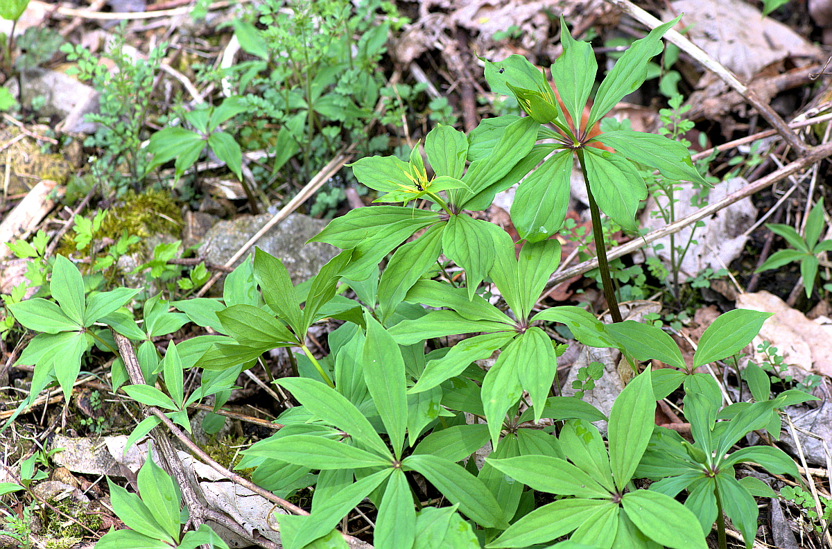줄기는 높이가 20∼40cm이고 끝 부분에 6∼8개의 잎이 돌려나며 달린다.