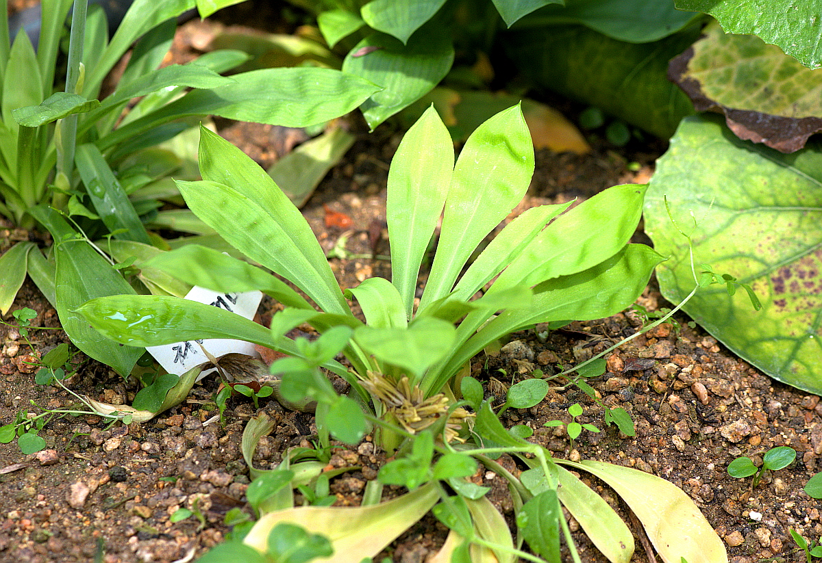 잎은 무더기로 나와서 꽃방석같이 퍼지고 거꾸로 선 바소꼴이며 녹색으로 윤기가 있다.
