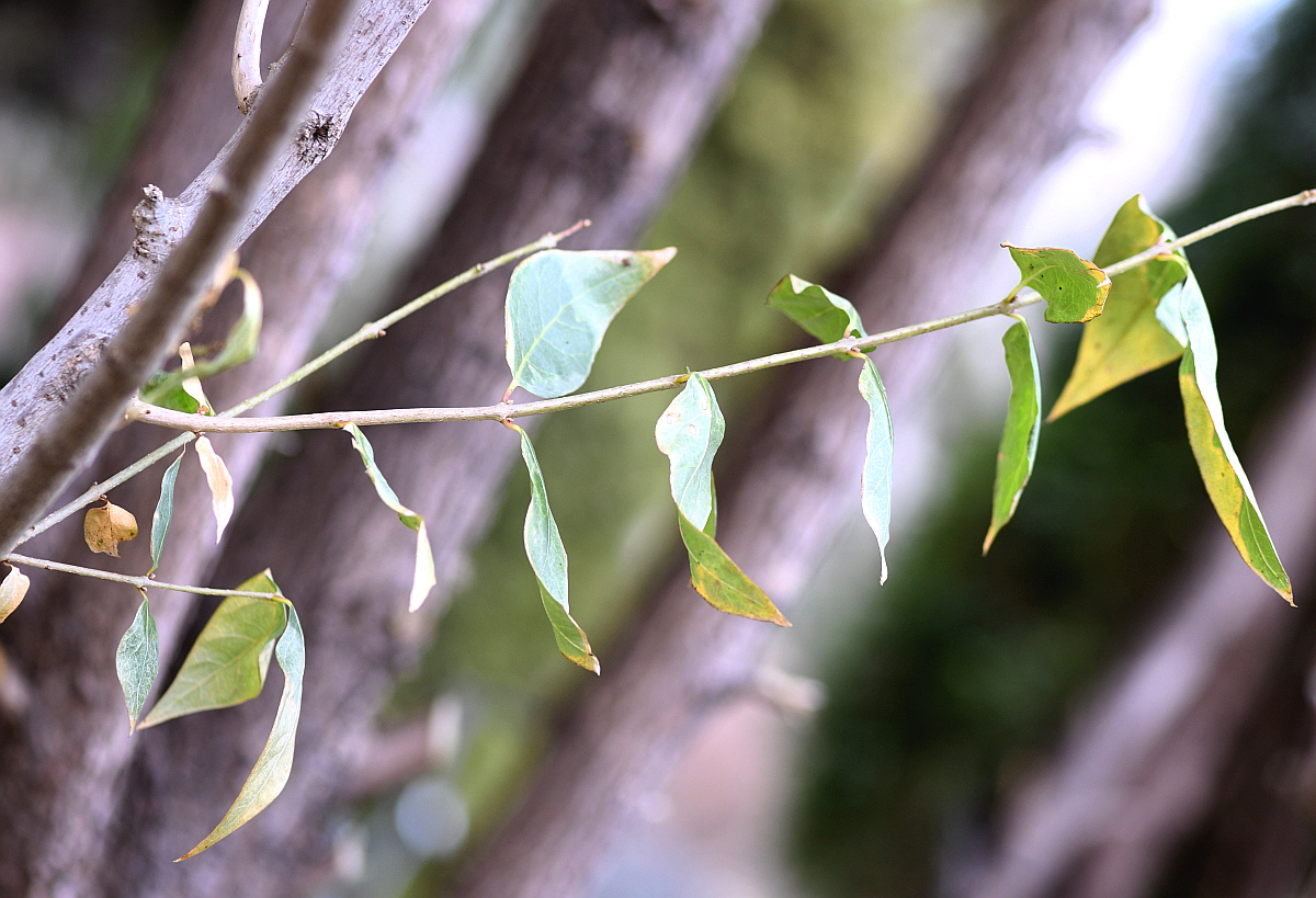 표면은 꺼칠꺼칠하고 잎자루가 짧으며, 잎 끝은 뾰족하고 얇지만 딱딱하고 가장자리에 톱니가 없다.